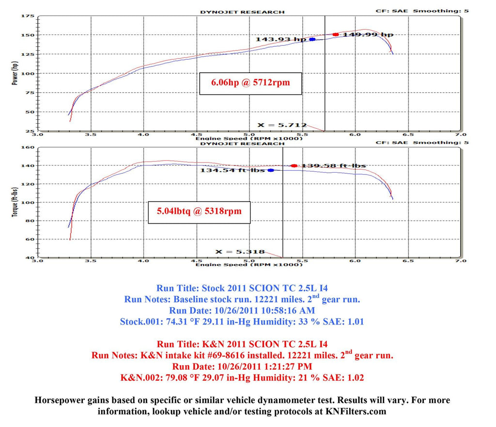 The K&N 69-8616TS Typhoon air intake system is a free-flowing, mandrel-bent aluminum tube air induction system designed to fit some Scion TC models. The restrictive factory air filter and air intake housing are replaced by the K&N Typhoon air intake which is designed to dramatically reduce air flow restriction as it smoothes and straightens air flow. This allows your engine to inhale a larger amount of air than the factory air intake. More air means more usable power and acceleration throughout the engine’s RPM range. The 69-8616TS air intake comes with an ultra-lightweight carbon fiber topped K&N high-flow air filter and a heat shield that installs into the previous air box space. Air is directed through the intake tube into the engine’s throttle body for a guaranteed power gain. The intake tube has an attractive silver powder-coat finish that's made to last and it accommodates the factory mass air sensor and a replacement silicone crank case vent hose. The tools needed are a couple of screwdrivers, a ratchet set and several wrenches. Some Typhoon air intakes are not legal for sale or use in California and other states adopting California emission standards while others are CARB exempt and 50 state legal. Check the K&N catalog or website for vehicle applications and specific CARB status for each vehicle and air intake.