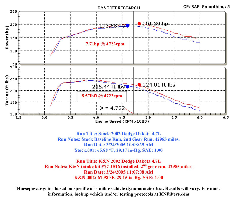 The K&N 77-1516KP high-flow performance air intake system is a free-flowing, mandrel-bent aluminum tube air induction system designed to fit some Dodge Durango and Dakota models. The restrictive factory air filter and air intake housing on your vehicle are replaced by this K&N air intake system which is designed to dramatically reduce air flow restriction as it smoothes and straightens air flow. The improved air flow allows your engine to inhale a larger amount of air than it would from the stock air intake. More air means more usable power and acceleration throughout your engine’s RPM range. The 77-1516KP air intake comes with a black rubber topped K&N high-flow air filter and a heat shield that installs into the previous air box space. Air is directed through the intake tube into the engine’s throttle body for a guaranteed power gain. The intake tube has an attractive chrome-like finish that's made to last and it accommodates the factory air temperature sensor and crank case vent hose. The oversized cone shaped air filter can be used for up to 100,000 miles before servicing is needed depending on driving conditions. This air intake is relatively easy to install usually in 90 minutes or less using existing factory mounting points requiring commonly available tools to do the job. Some K&N 77 series air intakes are not legal for sale or use in California and other states adopting California emission standards while others are CARB exempt and 50 state legal. Check the K&N catalog or website for vehicle applications and specific CARB status for each vehicle and air intake.