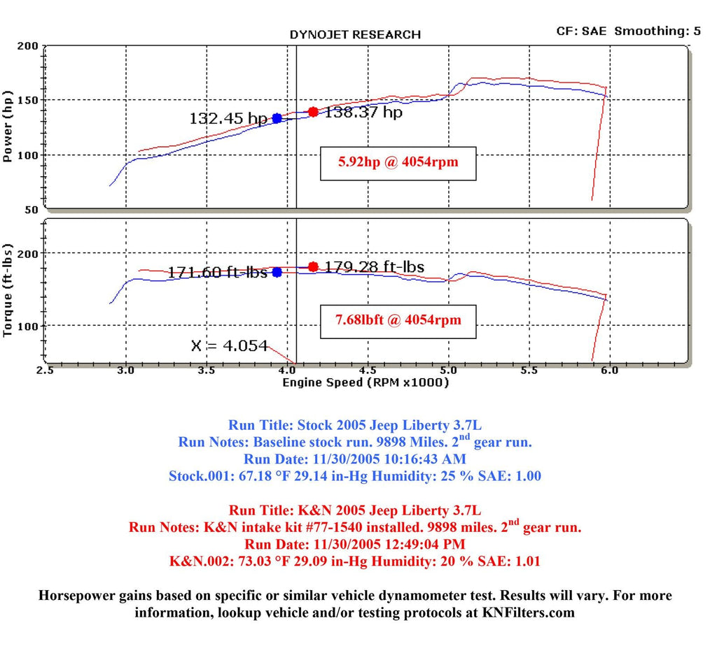 The K&N 77-1540KP high-flow performance air intake system is a free-flowing, mandrel-bent aluminum tube air induction system designed to fit some Jeep Liberty models. The restrictive factory air filter and air intake housing on your vehicle are replaced by this K&N air intake system which is designed to dramatically reduce air flow restriction as it smoothes and straightens air flow. The improved air flow allows your engine to inhale a larger amount of air than it would from the stock air intake. More air means more usable power and acceleration throughout your engine’s RPM range. The 77-1540KP air intake comes with a chrome topped K&N high-flow air filter and a heat shield that installs into the previous air box space. Air is directed through the intake tube into the engine’s throttle body for a guaranteed power gain. The intake tube has an attractive chrome-like finish that's made to last and it accommodates the factory air temperature sensor and a replacement silicone crank case vent hose. The oversized cone shaped air filter can be used for up to 100,000 miles before servicing is needed depending on driving conditions. This air intake is relatively easy to install usually in 90 minutes or less using existing factory mounting points requiring commonly available tools to do the job. Some K&N 77 series air intakes are not legal for sale or use in California and other states adopting California emission standards while others are CARB exempt and 50 state legal. Check the K&N catalog or website for vehicle applications and specific CARB status for each vehicle and air intake.