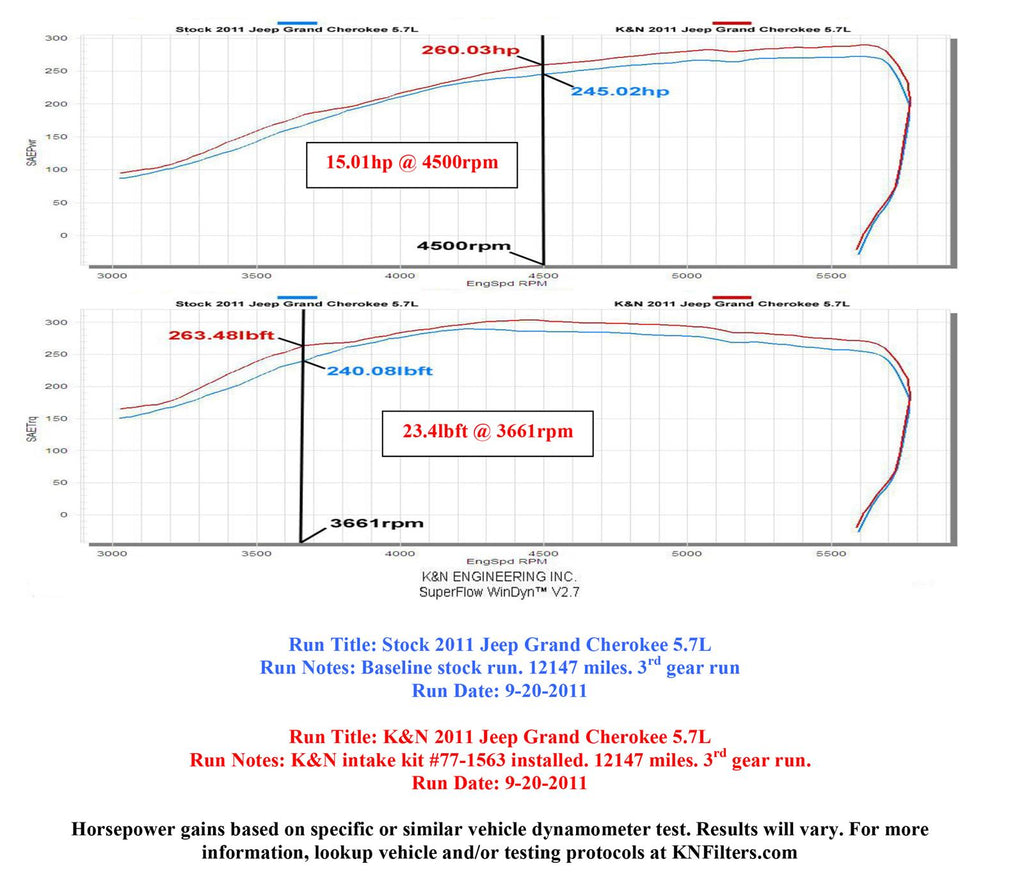 The K&N 77-1563KP high-flow performance air intake system is a free-flowing, mandrel-bent aluminum tube air induction system designed to fit some Jeep Wrangler and Dodge Durango models. The restrictive factory air filter and air intake housing on your vehicle are replaced by this K&N air intake system which is designed to dramatically reduce air flow restriction as it smoothes and straightens air flow. The improved air flow allows your engine to inhale a larger amount of air than it would from the stock air intake. More air means more usable power and acceleration throughout your engine’s RPM range. The 77-1563KP air intake comes with a chrome topped K&N high-flow air filter and a heat shield that installs into the previous air box space. Air is directed through the intake tube into the engine’s throttle body for a guaranteed power gain. The intake tube has an attractive chrome-like finish that's made to last and it accommodates the factory inlet air temperature sensor and crank case vent hose. The oversized cone shaped air filter can be used for up to 100,000 miles before servicing is needed depending on driving conditions. This air intake is relatively easy to install usually in 90 minutes or less using existing factory mounting points. The tools needed are a screwdriver, pliers, ratchet set and some wrenches. Some K&N 77 series air intakes are not legal for sale or use in California and other states adopting California emission standards while others are CARB exempt and 50 state legal. Check the K&N catalog or website for vehicle applications and specific CARB status for each vehicle and air intake.