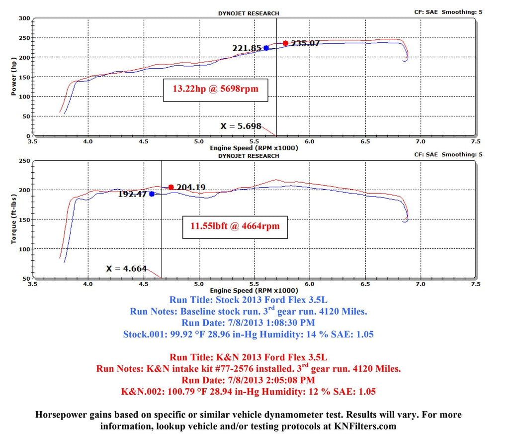 The K&N 77-2576KTK high-flow performance air intake system is a free-flowing, mandrel-bent aluminum tube air induction system designed to fit some Ford Flex and Taurus models. The restrictive factory air filter and air intake housing on your vehicle are replaced by this K&N air intake system which is designed to dramatically reduce air flow restriction as it smoothes and straightens air flow. The improved air flow allows your engine to inhale a larger amount of air than it would from the stock air intake. The intake tube has an attractive textured black powder-coat finish that's made to last and it accommodates the factory mass air sensor, crank case vent hose and a replacement silicone EVAP hose. The oversized cone shaped air filter can be used for up to 100,000 miles before servicing is needed depending on driving conditions. This air intake is relatively easy to install usually in 90 minutes or less using existing factory mounting points. The tools needed are a screwdriver, pliers, ratchet set and an Allen wrench. Some K&N 77 series air intakes are not legal for sale or use in California and other states adopting California emission standards while others are CARB exempt and 50 state legal. Check the K&N catalog or website for vehicle applications and specific CARB status for each vehicle and air intake.