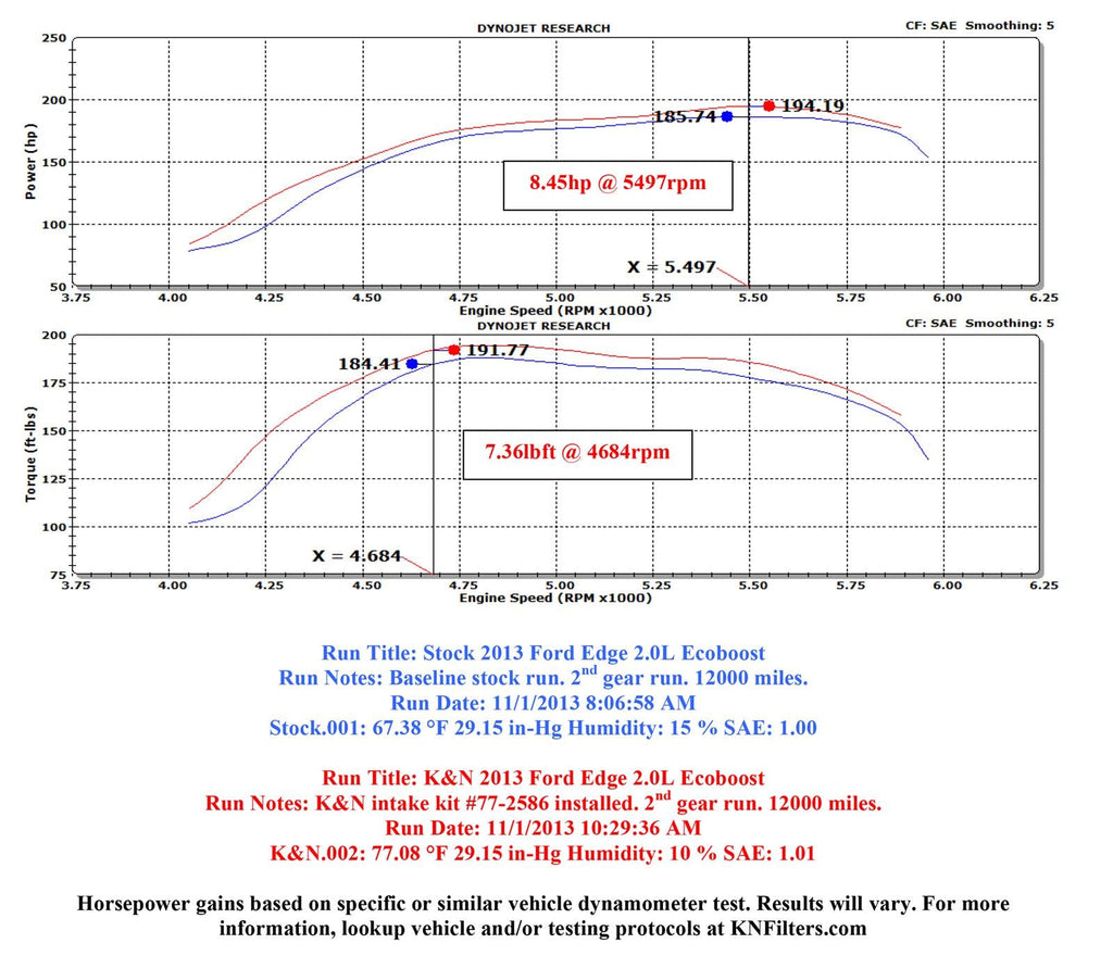 The K&N 77-2586KS high-flow performance air intake system is a free-flowing, mandrel-bent aluminum tube air induction system designed to fit some Ford Edge models. The restrictive factory air filter and air intake housing on your vehicle are replaced by this K&N air intake system which is designed to dramatically reduce air flow restriction as it smoothes and straightens air flow. The improved air flow allows your engine to inhale a larger amount of air than it would from the stock air intake. More air means more usable power and acceleration throughout your engine’s RPM range. The 77-2586KS air intake comes with a chrome topped K&N high-flow air filter and a heat shield that installs into the previous air box space. Air is directed through the intake tube into the engine’s throttle body for a guaranteed power gain. The intake tube has an attractive silver powder-coat finish that's made to last and it accommodates the factory air temperature sensor. The oversized cone shaped air filter can be used for up to 100,000 miles before servicing is needed depending on driving conditions. This air intake is relatively easy to install usually in 90 minutes or less using existing factory mounting points. The tools needed are a screwdriver, pliers, ratchet set and several wrenches. Some K&N 77 series air intakes are not legal for sale or use in California and other states adopting California emission standards while others are CARB exempt and 50 state legal. Check the K&N catalog or website for vehicle applications and specific CARB status for each vehicle and air intake.