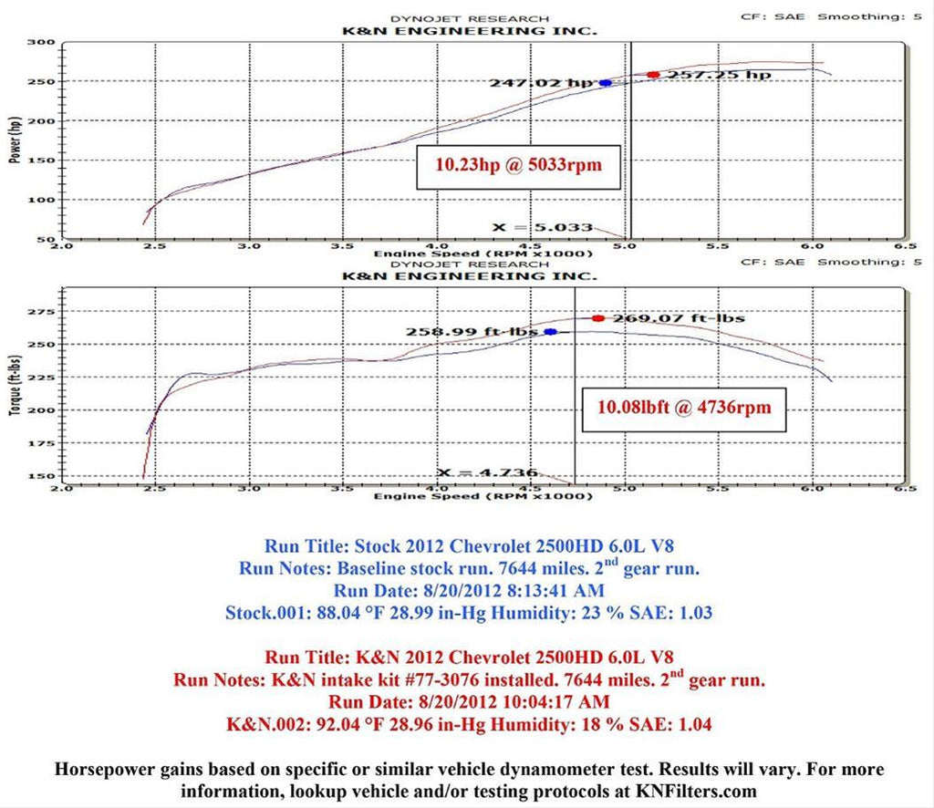 The K&N 77-3076KTK high-flow performance air intake system is a free-flowing, mandrel-bent aluminum tube air induction system designed to fit some Chevrolet Silverado 2500/3500 HD and GMC Sierra 2500/3500 HD models. The restrictive factory air filter and air intake housing on your vehicle are replaced by this K&N air intake system which is designed to dramatically reduce air flow restriction as it smoothes and straightens air flow. The improved air flow allows your engine to inhale a larger amount of air than it would from the stock air intake. More air means more usable power and acceleration throughout your engine’s RPM range. The 77-3076KTK air intake comes with a chrome topped K&N high-flow air filter and a lidded heat shield that installs into the previous airbox space. Air is directed through the intake tube into the engine’s throttle body for a guaranteed power gain. The intake tube has an attractive textured black powder coated finish that's made to last and it accommodates the factory mass air sensor and a replacement silicone crank case vent hoses. The oversized cone shaped air filter can be used for up to 100,000 miles before servicing is needed depending on driving conditions. This air intake is relatively easy to install usually in 90 minutes or less using existing factory mounting points. The tools needed are a couple of screwdrivers, a ratchet set, T-15 Torx driver and several wrenches. Some K&N 77 series air intakes are not legal for sale or use in California and other states adopting California emission standards while others are CARB exempt and 50 state legal. Check the K&N catalog or website for vehicle applications and specific CARB status for each vehicle and air intake.
