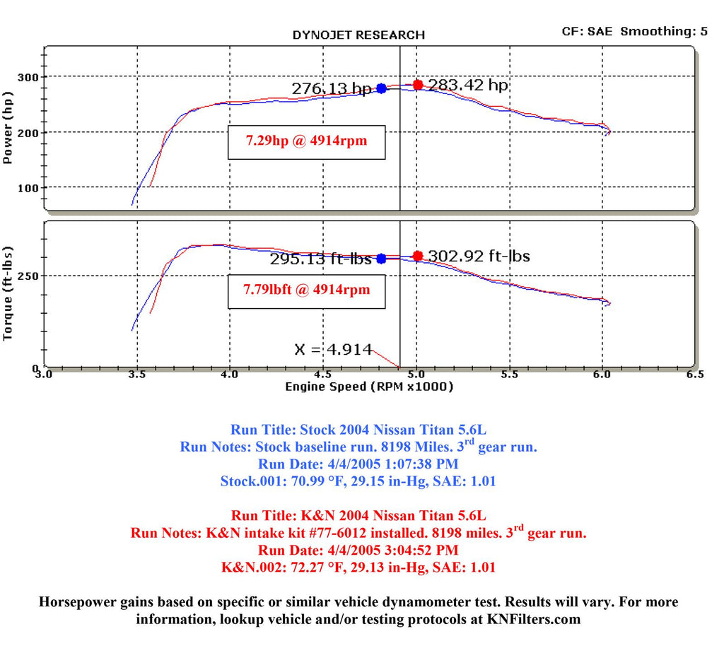 The K&N 77-6012KP high-flow performance air intake system is a free-flowing, mandrel-bent aluminum tube air induction system designed to fit some Nissan Armada or Titan and Infiniti QX56 models. The restrictive factory air filter and air intake housing on your vehicle are replaced by this K&N air intake system which is designed to dramatically reduce air flow restriction as it smoothes and straightens air flow. The improved air flow allows your engine to inhale a larger amount of air than it would from the stock air intake. More air means more usable power and acceleration throughout your engine’s RPM range. The 77-6012KP air intake comes with a chrome topped K&N high-flow air filter and a heat shield that installs into the previous air box space. Air is directed through the intake tube into the engine’s throttle body for a guaranteed power gain. The intake tube has an attractive chrome-like finish that's made to last and it accommodates the factory mass air sensor and crank case vent hose. The oversized cone shaped air filter can be used for up to 100,000 miles before servicing is needed depending on driving conditions. This air intake is relatively easy to install usually in 90 minutes or less using existing factory mounting points. The tools needed are a couple of screwdrivers, pliers, a ratchet set and some wrenches. Some K&N 77 series air intakes are not legal for sale or use in California and other states adopting California emission standards while others are CARB exempt and 50 state legal. Check the K&N catalog or website for vehicle applications and specific CARB status for each vehicle and air intake.