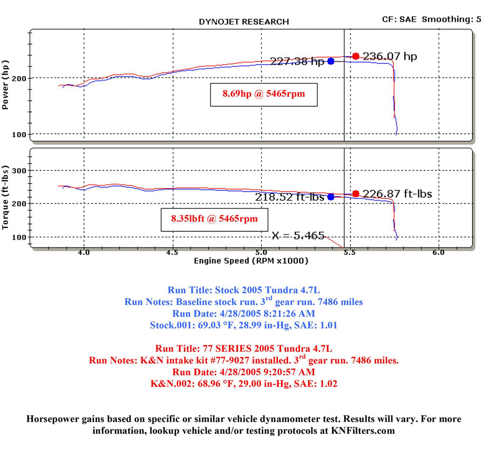 The K&N 77-9027KP high-flow performance air intake system is a free-flowing, mandrel-bent aluminum tube air induction system designed for some Toyota Tundra and Sequoia models. The restrictive factory air filter and air intake housing on your vehicle are replaced by this K&N air intake system which is designed to dramatically reduce air flow restriction as it smoothes and straightens air flow. The improved air flow allows your engine to inhale a larger amount of air than it would from the stock air intake. More air means more usable power and acceleration throughout your engine’s RPM range. The 77-9027KP air intake comes with a chrome topped K&N high-flow air filter and a heat shield that installs into the previous air box space. Air is directed through the intake tube into the engine’s throttle body for a guaranteed power gain. The intake tube has an attractive chrome-like finish that's made to last and it accommodates the factory mass air sensor and the power steering pressure switch vent hose as well as a replacement silicone fuel pressure regulator vent hose and crank case vent hose. The oversized cone shaped air filter can be used for up to 100,000 miles before servicing is needed depending on driving conditions. This air intake is relatively easy to install usually in 90 minutes or less using existing factory mounting points. The tools needed are a screwdriver, ratchet set and several wrenches. Some K&N 77 series air intakes are not legal for sale or use in California and other states adopting California emission standards while others are CARB exempt and 50 state legal. Check the K&N catalog or website for vehicle applications and specific CARB status for each vehicle and air intake.