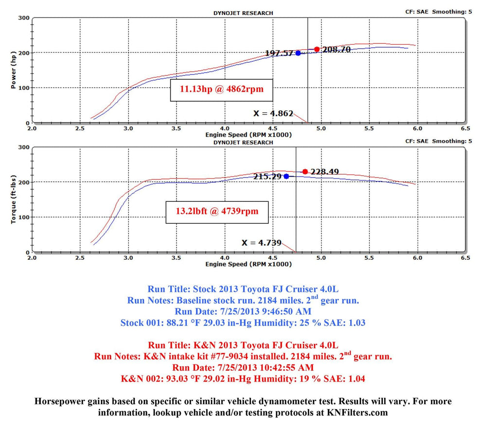 The K&N 77-9034KP high-flow performance air intake system is a free-flowing, mandrel-bent aluminum tube air induction system designed to fit some Toyota 4 Runner and FJ Cruiser models. The restrictive factory air filter and air intake housing on your vehicle are replaced by this K&N air intake system which is designed to dramatically reduce air flow restriction as it smoothes and straightens air flow. The improved air flow allows your engine to inhale a larger amount of air than it would from the stock air intake. More air means more usable power and acceleration throughout your engine’s RPM range. The 77-9034KP air intake comes with a chrome topped K&N high-flow air filter and a lidded heat shield that installs into the previous air box space. Air is directed through the intake tube into the engine’s throttle body for a guaranteed power gain. The intake tube has an attractive chrome-like finish that's made to last and it accommodates the factory mass air sensor, crank case vent hose and a replacement silicone fuel pressure vent line. The oversized cone shaped air filter can be used for up to 100,000 miles before servicing is needed depending on driving conditions. This air intake is relatively easy to install usually in 90 minutes or less using existing factory mounting points. The tools needed are a screwdriver, pliers, ratchet set and some wrenches. Some K&N 77 series air intakes are not legal for sale or use in California and other states adopting California emission standards while others are CARB exempt and 50 state legal. Check the K&N catalog or website for vehicle applications and specific CARB status for each vehicle and air intake.