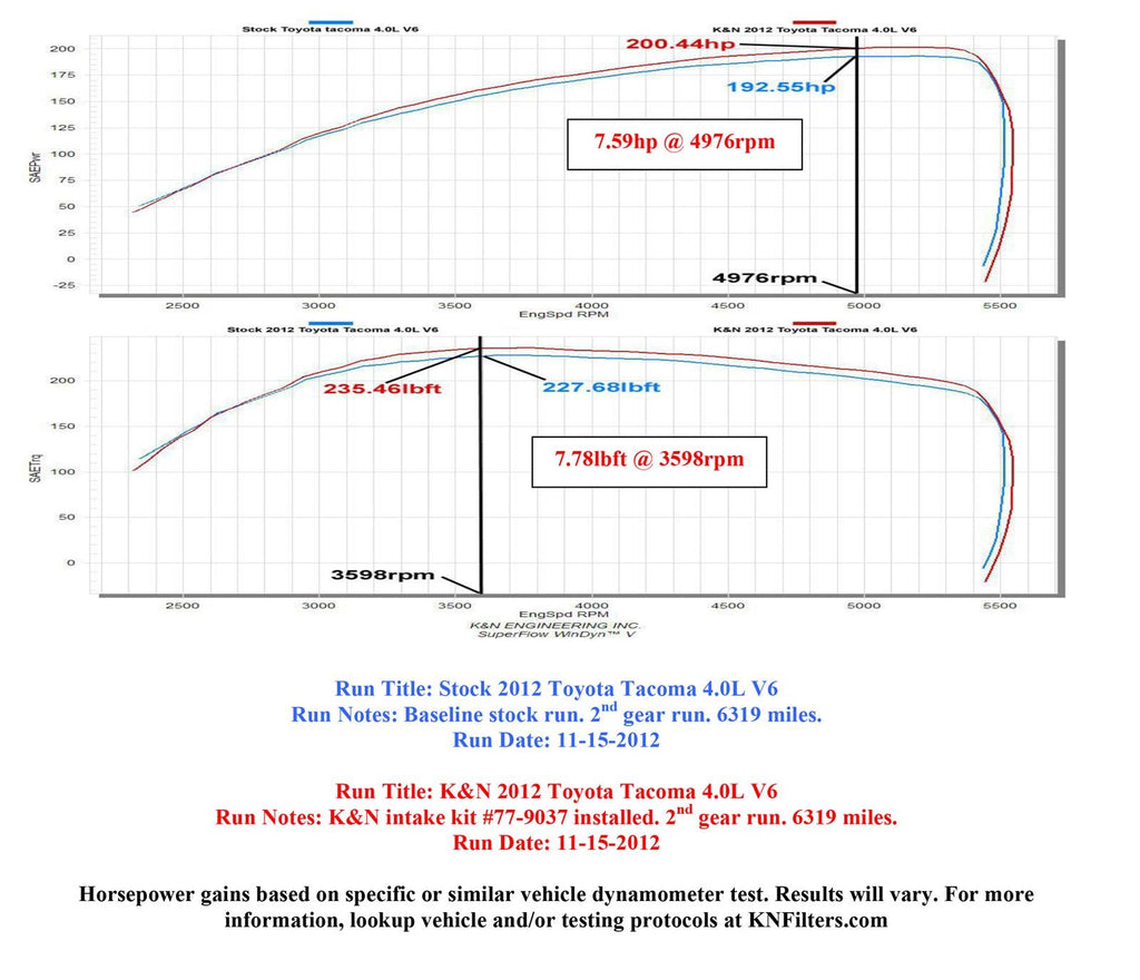 The K&N 77-9037KP high-flow performance air intake system is a free-flowing, mandrel-bent aluminum tube air induction system designed to fit some Toyota Tacoma models. The restrictive factory air filter and air intake housing on your vehicle are replaced by this K&N air intake system which is designed to dramatically reduce air flow restriction as it smoothes and straightens air flow. The improved air flow allows your engine to inhale a larger amount of air than it would from the stock air intake. More air means more usable power and acceleration throughout your engine’s RPM range. The 77-9037KP air intake comes with a chrome topped K&N high-flow air filter and a heat shield that installs into the previous air box space. Air is directed through the intake tube into the engine’s throttle body for a guaranteed power gain. The intake tube has an attractive chrome-like finish that's made to last and it accommodates the factory mass air sensor, crank case vent hose and a replacement silicone fuel pressure vent hose. The oversized cone shaped air filter can be used for up to 100,000 miles before servicing is needed depending on driving conditions. This air intake is relatively easy to install usually in 90 minutes or less using existing factory mounting points. The tools needed are a couple of screwdrivers, pliers, a ratchet set and some wrenches. Some K&N 77 series air intakes are not legal for sale or use in California and other states adopting California emission standards while others are CARB exempt and 50 state legal. Check the K&N catalog or website for vehicle applications and specific CARB status for each vehicle and air intake.