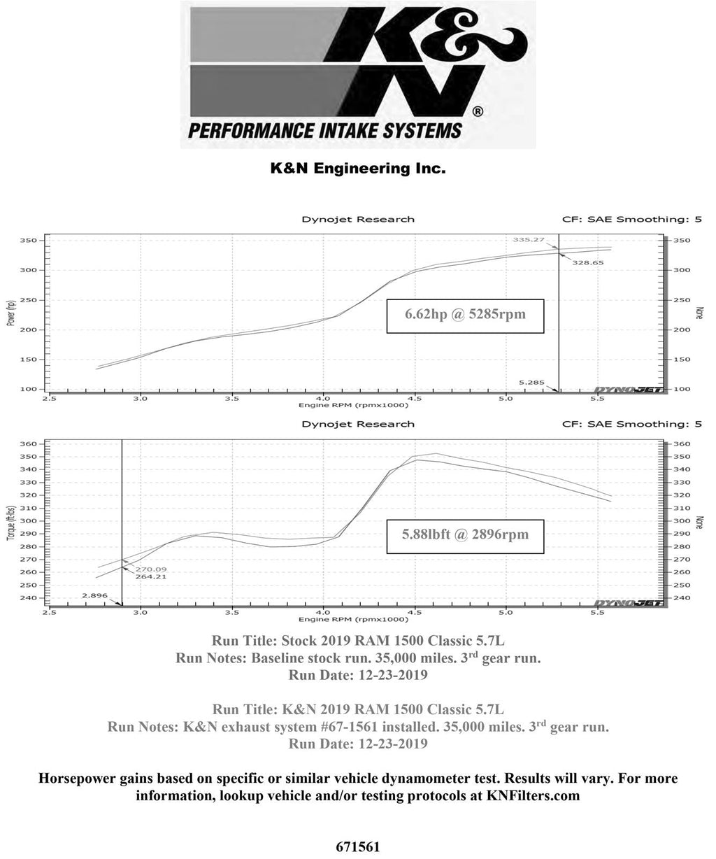 K&N muffler replacement kits are engineered to increase performance, deliver robust sound, and install quickly and easily. Enjoy excellent quality, combined with a simple and clean appearance. These kits maintain clearance to critical systems, and typically install in less than 30 minutes using factory mounting points (no cutting or welding necessary). K&N muffler replacement kits pair with most aftermarket modifications, including intake systems, throttle control modules, and more. No calibration tuning is required, and complete instructions are included. Order the model recommended for fitment on your vehicle.Brand: K&N
