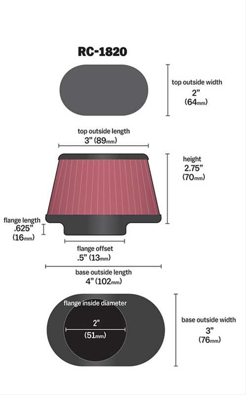 K&N's universal performance air filters are designed and manufactured for a wide variety of applications, including racing vehicles, radio-controlled cars, generators, snowmobiles, tractors, and more. Many hundreds of models are are available, so regardless of the angle or offset diameter of your air intake, there is likely a K&N universal air filter for your equipment. All filters are constructed with ultra-strong, molded, pliable rubber flanges, which absorb vibration, allow for secure attachment, and can be stretched for up to 1/16 in. (1.5mm) to fit in-between sizes. K&N universal air filters are washable and reusable. Order the style and size that best suits your needs.Brand: K&N