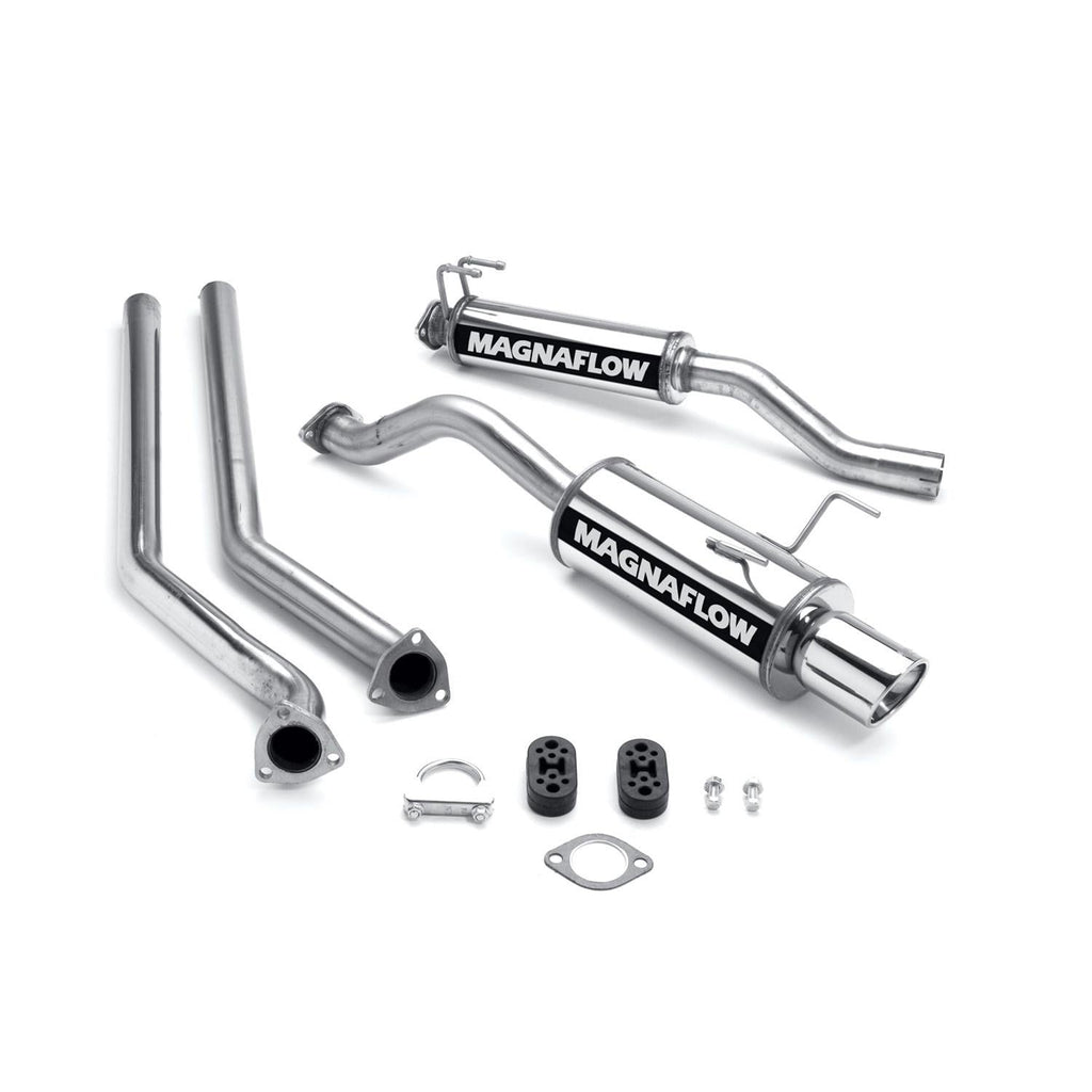 MagnaFlow Street Series performance exhaust systems deliver the smooth, deep sound you want—and the wide-open performance power you need! They feature straight-through flow designs for the ultimate in unrestricted horsepower and torque, while maintaining exhaust efficiency. These kits are an engineered balance of interior and exterior noise levels and are tested against SAE j1169 standards. Street Series components are built with 409 stainless steel and all mandrel-bent tubing. They're available in numerous configurations, including cat-back, rear axle-back, crossmember-back, and rear section; single, dual, tri, or quad turbo mufflers; and several outlet and tip options. Order the MagnaFlow Street Series performance exhaust tailored for your specific make and model. The systems carry a lifetime construction warranty.Brand: MagnaFlow