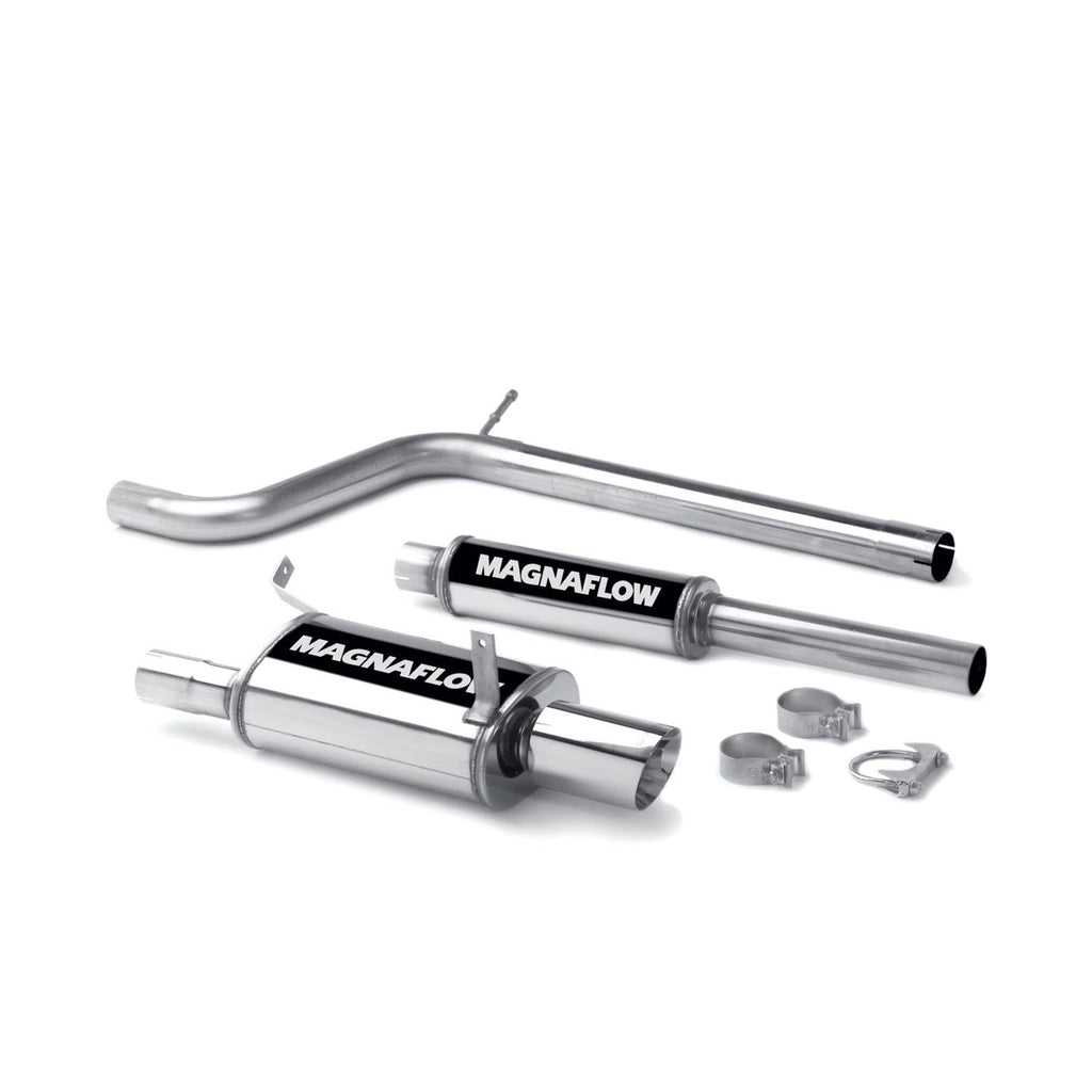 MagnaFlow Street Series performance exhaust systems deliver the smooth, deep sound you want—and the wide-open performance power you need! They feature straight-through flow designs for the ultimate in unrestricted horsepower and torque, while maintaining exhaust efficiency. These kits are an engineered balance of interior and exterior noise levels and are tested against SAE j1169 standards. Street Series components are built with 409 stainless steel and all mandrel-bent tubing. They're available in numerous configurations, including cat-back, rear axle-back, crossmember-back, and rear section; single, dual, tri, or quad turbo mufflers; and several outlet and tip options. Order the MagnaFlow Street Series performance exhaust tailored for your specific make and model. The systems carry a lifetime construction warranty.Brand: MagnaFlow