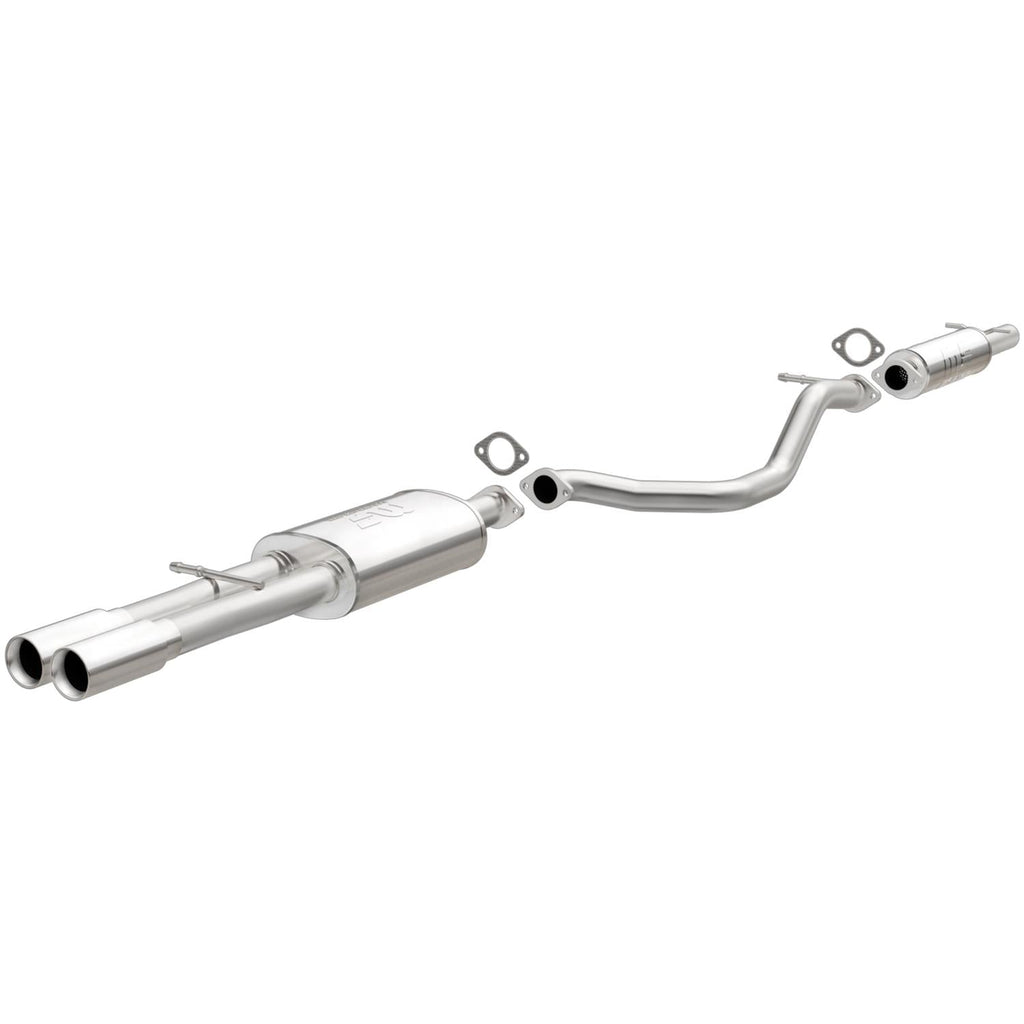 MagnaFlow Touring Series performance exhaust systems are an ideal choice for those seeking increased performance and better economy. Their straight-through flow designs deliver the ultimate in unrestricted horsepower and torque, while maintaining exhaust efficiency. An engineered balance of interior and exterior noise levels, these kits offer the smooth, deep sound you want—and the wide-open power you need! Touring Series systems feature 409 stainless steel components, all mandrel-bent tubing, and a lifetime construction warranty; they're tested against SAE j1169 standards. MagnaFlow Touring Series performance exhausts are available in numerous configurations, including cat-back and rear axle-back; single, dual, tri, or quad mufflers; and several outlet and tip options. Order the model tailored for fitment on your specific vehicle.Brand: MagnaFlow