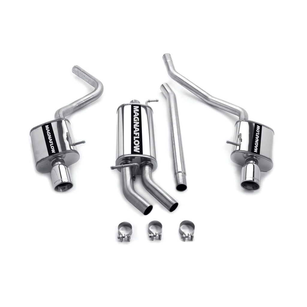 MagnaFlow Touring Series performance exhaust systems are an ideal choice for those seeking increased performance and better economy. Their straight-through flow designs deliver the ultimate in unrestricted horsepower and torque, while maintaining exhaust efficiency. An engineered balance of interior and exterior noise levels, these kits offer the smooth, deep sound you want—and the wide-open power you need! Touring Series systems feature 409 stainless steel components, all mandrel-bent tubing, and a lifetime construction warranty; they're tested against SAE j1169 standards. MagnaFlow Touring Series performance exhausts are available in numerous configurations, including cat-back and rear axle-back; single, dual, tri, or quad mufflers; and several outlet and tip options. Order the model tailored for fitment on your specific vehicle.Brand: MagnaFlow