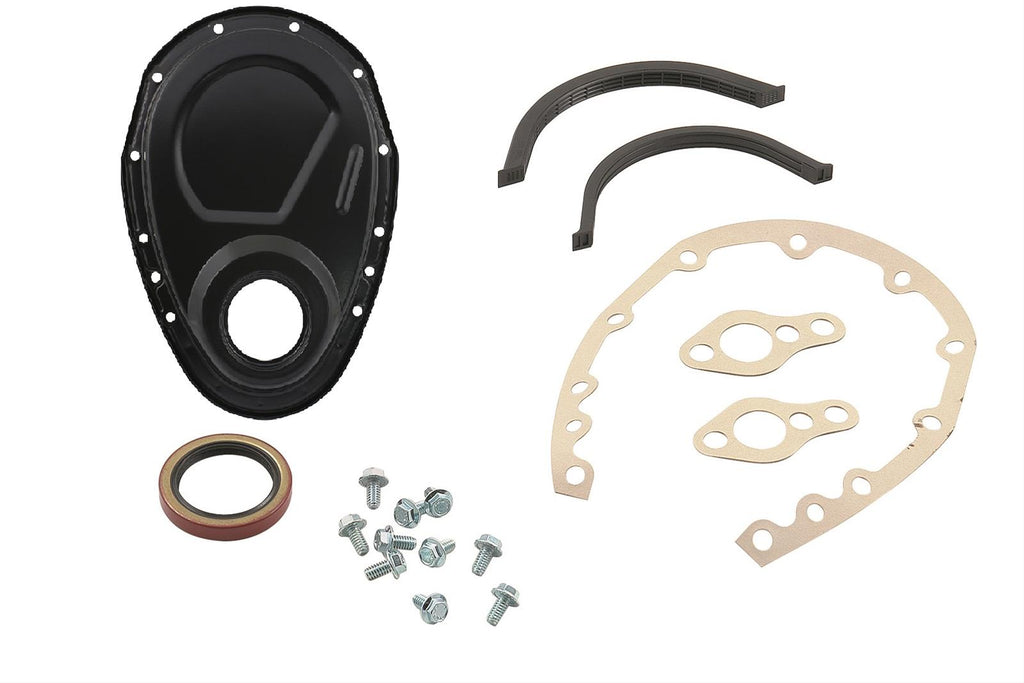 Notes: Kit includes timing cover, bolts, front oil pan seal, front seal, and water pump gaskets. For use with OEM style timing chains. Others require checking for adequate clearance.