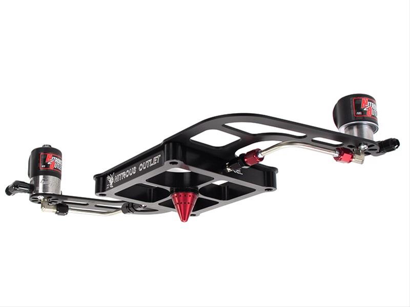 Nitrous Outlet 4500 GENIII Stinger plate conversion kits come out of the box with everything you need to spray up to 500 hp. Their revolutionary extended-reach cone is the first in its class. The extended "Stinger" sits further down inside the intake plane to prevent nitrous from hitting the sidewalls on intakes with a high plane or spacer plate. You get all of the same great features of the Stinger II, in an upgraded package! The Stinger plate features a large, unique cone shaped "stinger" that protrudes from the bottom portion of the plate into the center of the intake throat. Each Stinger has 15 discharge ports for nitrous and 15 discharge ports for fuel. The 15 atomized plumes of nitrous and fuel exit from the center of the stinger into the intake plenum in a 360 degree pattern, completely saturating the air intake charge as it enters the intake plenum for even distribution. The plates are CNC-machined from 6061 billet aluminum, have a black anodized body and a red anodized stinger, and are CNC-engraved with the Nitrous Outlet logo. Conversion kits include the GENIII 4500 Stinger plate, .122 nitrous solenoid, .187 fuel solenoid, Boomerang 2 solenoid bracket, gasket, and 50-600 hp jetting.