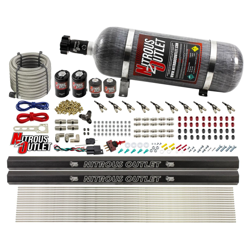 Nitrous Outlet direct port nitrous systems are designed to be high-flowing for high-horsepower applications. These systems come with one nozzle per cylinder—capable of flowing 200 hp each—providing the most dependable way to ensure equal distribution of nitrous and fuel in each cylinder. The direct port systems are fully customizable, letting you personalize a nitrous setup based on your fuel type, fuel pressure, nozzle type, bottle size, and solenoids. If you need a high-horsepower nitrous application for your vehicle, you've come to the right place. Nitrous Outlet direct port nitrous systems will give you everything you can handle.