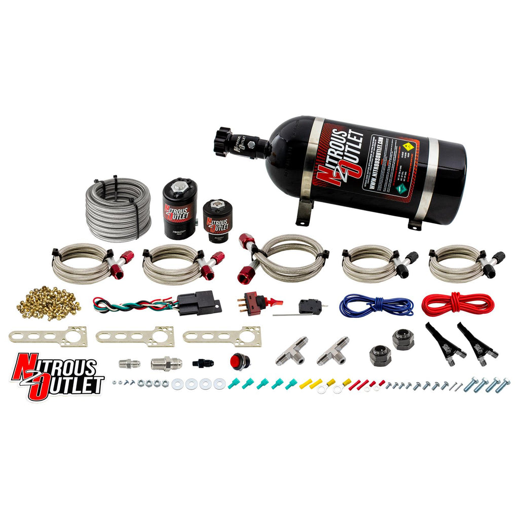 Nitrous Outlet EFI dual-nozzle systems deliver the nitrous in two locations for improved atomization over a single-nozzle system. Designed to work with any late model vehicle, these systems include everything needed to add up to 150 hp to your vehicle--hardware, wiring, jetting, solenoids, hoses, and two 1/8 NPT nozzles. They also include a wide-open throttle (WOT) switch that only allows the systems to be activated when the motor is at full throttle. This feature will help in preventing engine damage and lean spikes. These complete race-proven Nitrous Outlet systems have quality components for extreme performance.Brand: Nitrous Outlet