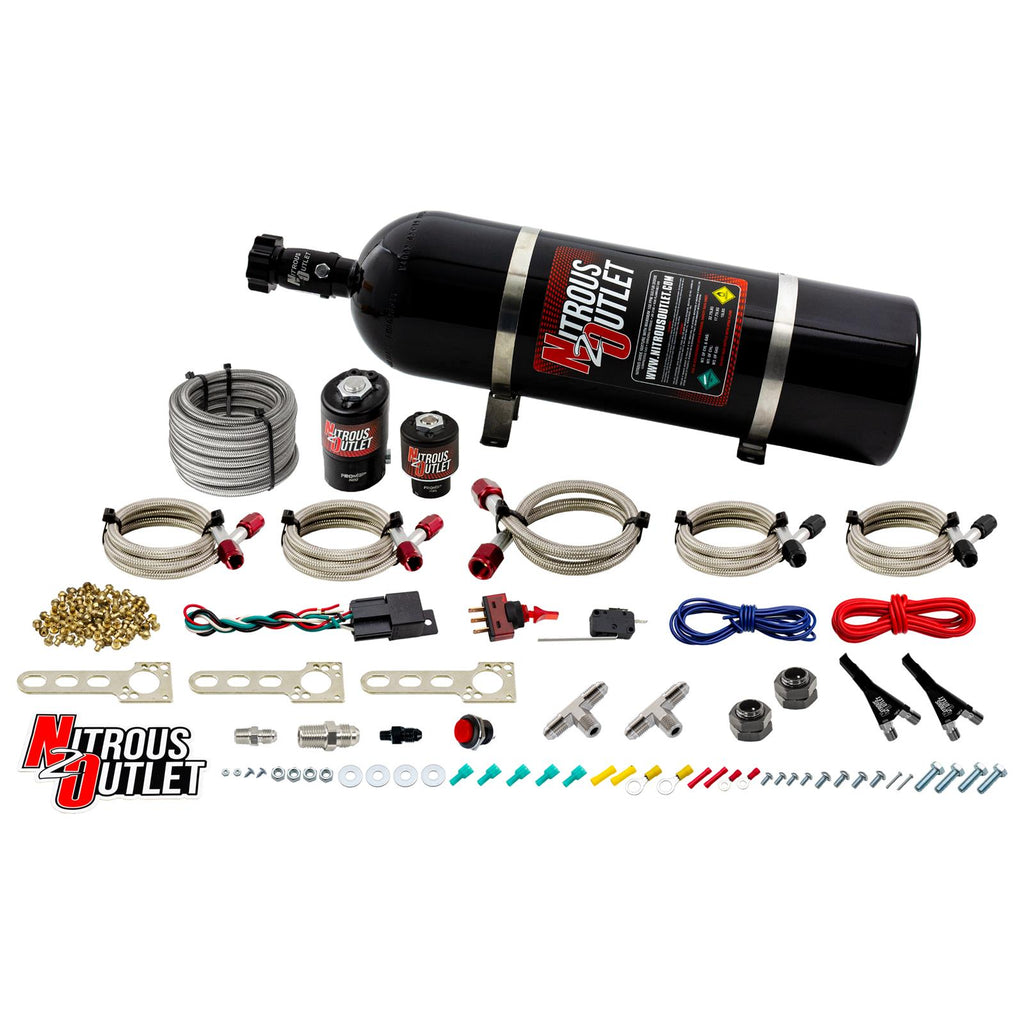 Nitrous Outlet EFI dual-nozzle systems deliver the nitrous in two locations for improved atomization over a single-nozzle system. Designed to work with any late model vehicle, these systems include everything needed to add up to 150 hp to your vehicle--hardware, wiring, jetting, solenoids, hoses, and two 1/8 NPT nozzles. They also include a wide-open throttle (WOT) switch that only allows the systems to be activated when the motor is at full throttle. This feature will help in preventing engine damage and lean spikes. These complete race-proven Nitrous Outlet systems have quality components for extreme performance.Brand: Nitrous Outlet