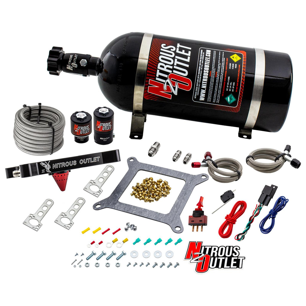 Nitrous Outlet Stinger Plate nitrous oxide systems feature a second generation Stinger plate designed to work with either 4150 or 4500 flanged carbureted-style intake manifolds. The new billet aluminum Stinger plate has a larger conical cone than the previous version and is based off of the same technology as the Nitrous Outlet Nitrous Puck, enabling them to delivering up to 600 hp with proper jetting. The plate features 15 discharge ports for nitrous and 15 discharge ports for fuel. The 15 atomized plumes of nitrous and fuel exit from the center of the stinger into the intake plenum in a 360 degree pattern, completely saturating the air intake charge as it enters the intake plenum for even distribution. Nitrous Outlet Stinger Plate nitrous oxide systems include nitrous and fuel solenoids, solenoid brackets, a main feed line, relay, harness, jetting, hardware, and wiring.Brand: Nitrous Outlet