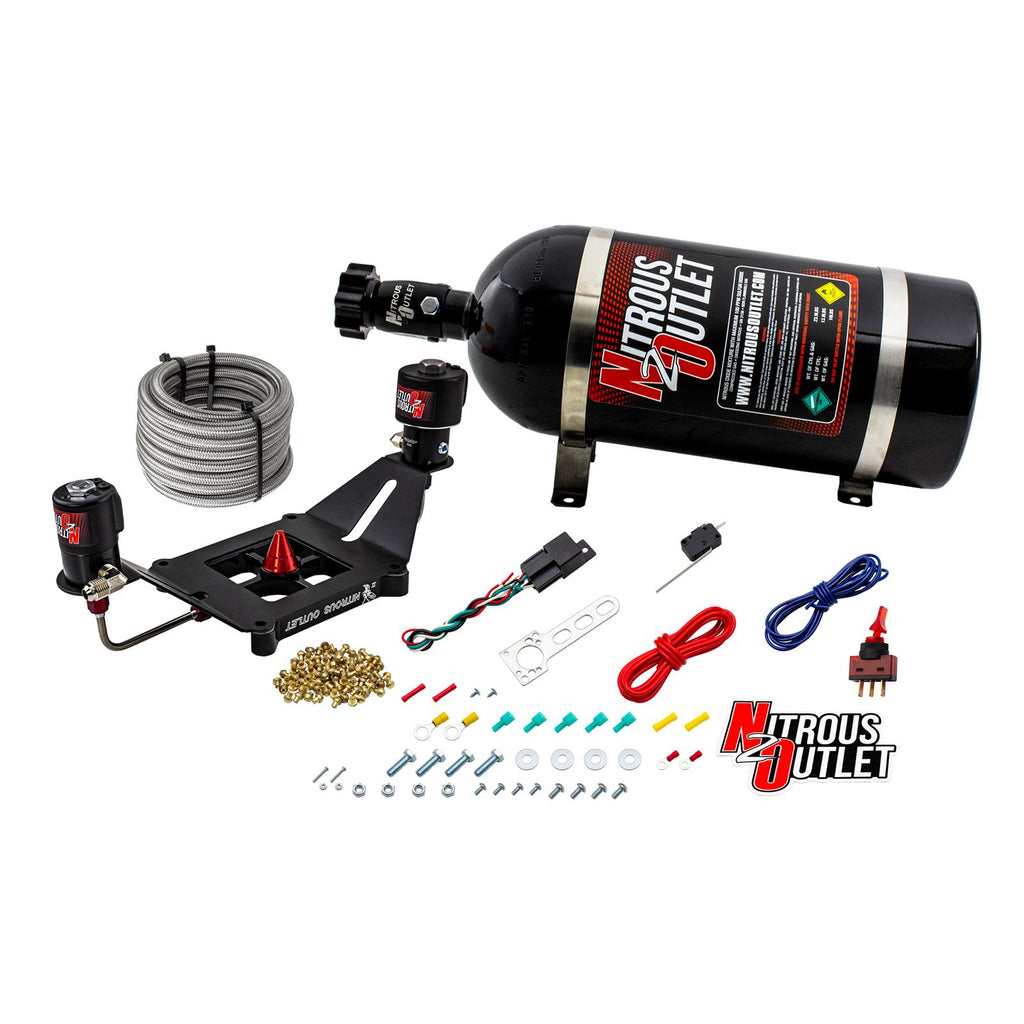 Nitrous Outlet Stinger Plate nitrous oxide systems feature a second generation Stinger plate designed to work with either 4150 or 4500 flanged carbureted-style intake manifolds. The new billet aluminum Stinger plate has a larger conical cone than the previous version and is based off of the same technology as the Nitrous Outlet Nitrous Puck, enabling them to delivering up to 600 hp with proper jetting. The plate features 15 discharge ports for nitrous and 15 discharge ports for fuel. The 15 atomized plumes of nitrous and fuel exit from the center of the stinger into the intake plenum in a 360 degree pattern, completely saturating the air intake charge as it enters the intake plenum for even distribution. Nitrous Outlet Stinger Plate nitrous oxide systems include nitrous and fuel solenoids, solenoid brackets, a main feed line, relay, harness, jetting, hardware, and wiring.Brand: Nitrous Outlet