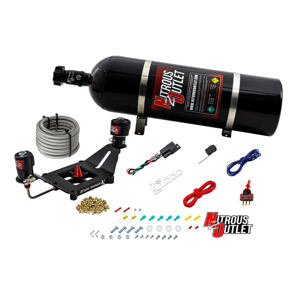 Nitrous Outlet Stinger Plate nitrous oxide systems feature a second generation Stinger plate designed to work with either 4150 or 4500 flanged carbureted-style intake manifolds. The new billet aluminum Stinger plate has a larger conical cone than the previous version and is based off of the same technology as the Nitrous Outlet Nitrous Puck, enabling them to delivering up to 600 hp with proper jetting. The plate features 15 discharge ports for nitrous and 15 discharge ports for fuel. The 15 atomized plumes of nitrous and fuel exit from the center of the stinger into the intake plenum in a 360 degree pattern, completely saturating the air intake charge as it enters the intake plenum for even distribution. Nitrous Outlet Stinger Plate nitrous oxide systems include nitrous and fuel solenoids, solenoid brackets, a main feed line, relay, harness, jetting, hardware, and wiring.Brand: Nitrous Outlet