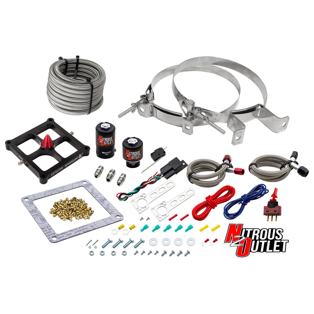 Nitrous Outlet Stinger Plate nitrous oxide systems feature a second generation Stinger plate designed to work with either 4150 or 4500 flanged carbureted-style intake manifolds. The new billet aluminum Stinger plate has a larger conical cone than the previous version and is based off of the same technology as the Nitrous Outlet Nitrous Puck, enabling them to delivering up to 600 hp with proper jetting. The plate features 15 discharge ports for nitrous and 15 discharge ports for fuel. The 15 atomized plumes of nitrous and fuel exit from the center of the stinger into the intake plenum in a 360 degree pattern, completely saturating the air intake charge as it enters the intake plenum for even distribution. Nitrous Outlet Stinger Plate nitrous oxide systems include nitrous and fuel solenoids, solenoid brackets, a main feed line, relay, harness, jetting, hardware, and wiring.Brand: Nitrous Outlet