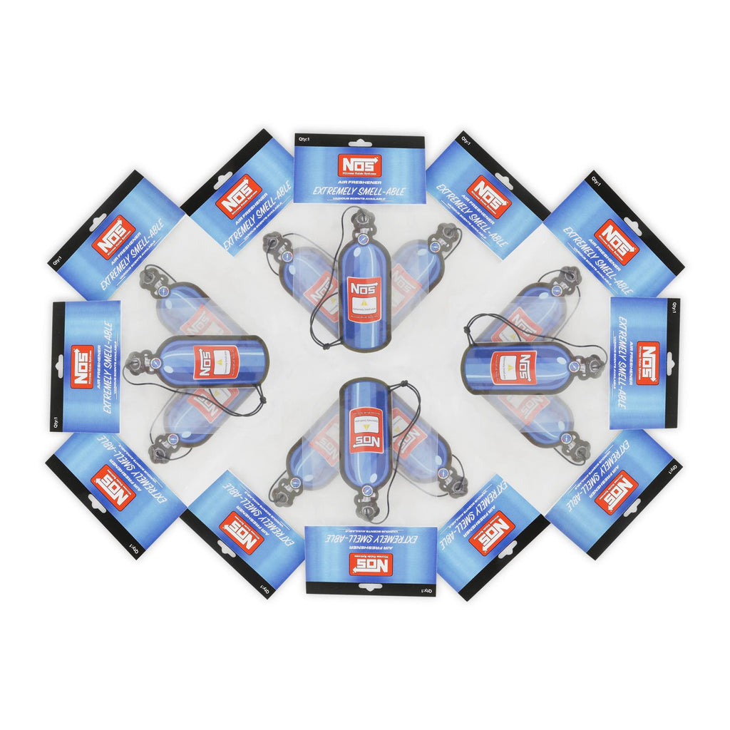 NOS air fresheners are the perfect addition to any ride! They offer pleasant scents, easy attachment, and drag racing style. The 4 in. x 1.5 in. paper air fresheners are available in aromas such as cherry, apple, vanilla, coconut, leather, new car, and nitrous ice. Each piece is shaped like a nitrous oxide bottle with NOS graphics. An elastic string lets you hang the air freshener from your rear view mirror—or other places, like an office cubicle, shop, or garage.Brand: Nitrous Oxide Systems (NOS)