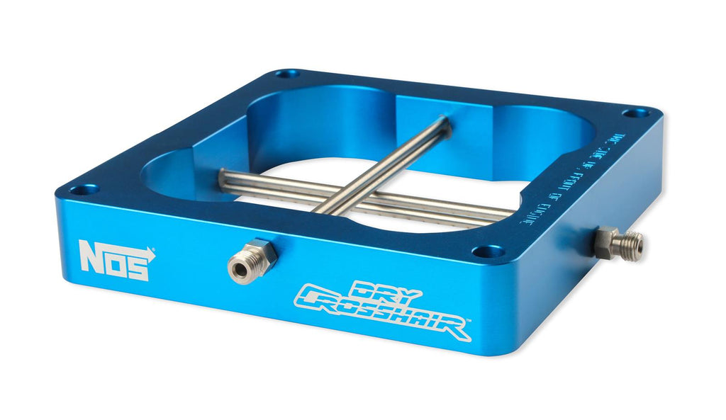 These NOS CrossHair nitrous oxide plates have been designed with the serious racer in mind are capable of 350+ hp. They are based off of the popular Double Cross plate and have improved distribution of the fuel and nitrous, helping with today's complex intake manifold designs. The plates feature double down nitrous bars for better distribution and atomization, putting more power down to the track. NOS CrossHair nitrous oxide plates come in a blue anodized finish, your choice of Holley 4150 or Dominator bolt patterns, jets, plumbing, and two gaskets.Brand: Nitrous Oxide Systems (NOS)