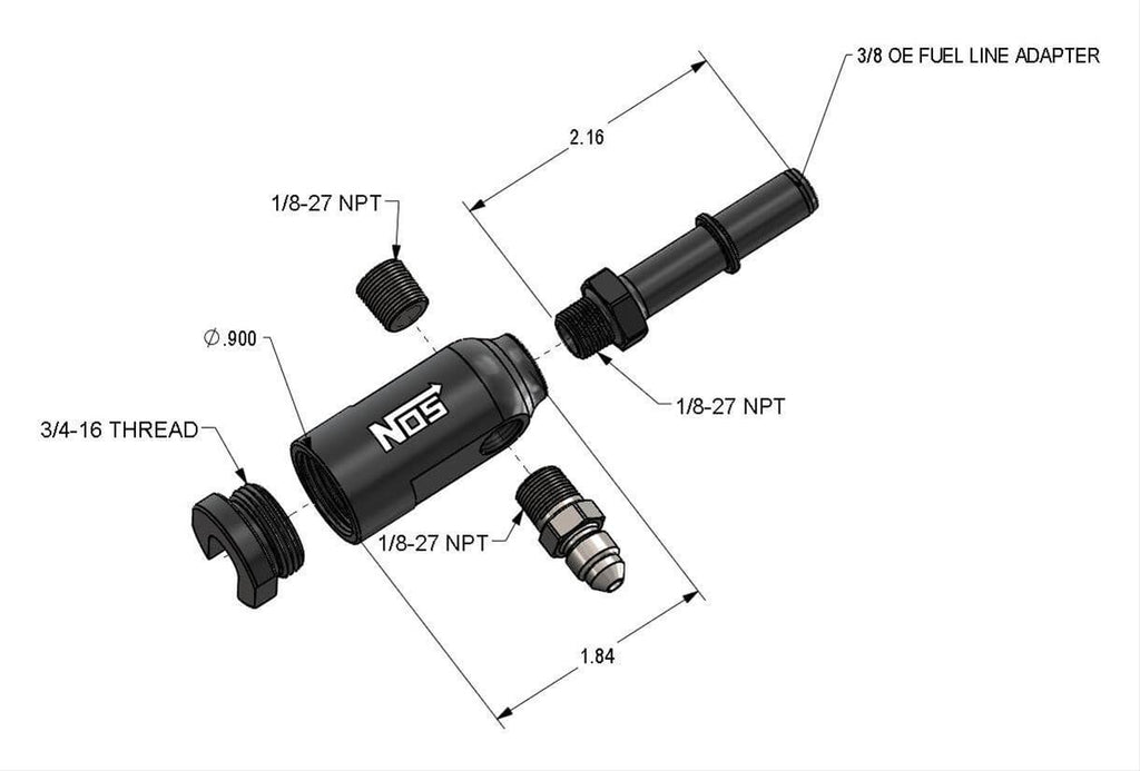 NOS late model billet fuel line adapters eliminate cutting, drilling, and modifications when installing nitrous on a late model fuel injected vehicle. These black anodized adapters will ease some of your plumbing problems. Simply disconnect the OE fuel hose and install an adapter between the OE fuel rail and fuel hose. The adapters include 1/8 in. NPT ports and are available in multiple fitting sizes.