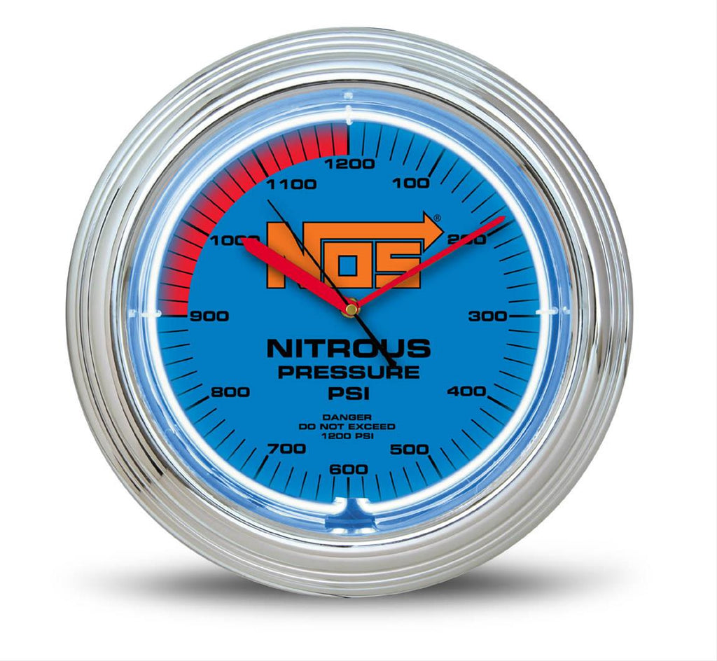 Juice up your day with NOS neon clocks! Patterned after NOS nitrous gauges, these 10 in. clocks feature a 100 to 1,200 psi display, blue face, red minute hands, a black second hand, a chrome bezel, and a blue neon ring. These powerful timepieces make great accessories for the office, garage, or storefront and run on a AA battery (not included).Brand: Nitrous Oxide Systems (NOS)