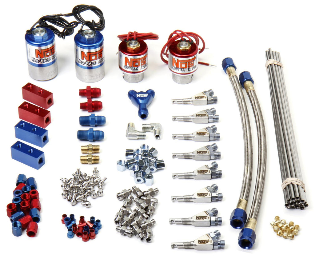 NOS Pro Race Fogger Professional kits have logged many hours of research and development at the race track. They're available with soft plume fogger or annular fogger nozzles. The kits also feature new distribution blocks and solenoids. The distribution blocks are manufactured from billet aluminum and are bright dip anodized in red and blue. They also use 3/16 in. compression fittings that are compatible with hard line or poly line. NOS Pro Race Fogger Professional kits include a new Pro Race nitrous solenoid, featuring a proprietary plunger material that resists swelling, and yet seals as well as Viton ®-type material. The nitrous solenoids have a blue powdercoated housing and the Cheater fuel solenoid has a red powdercoat for easy identification. Achieve up to an additional 800 hp with select NOS Pro Race Fogger Professional kits.Brand: Nitrous Oxide Systems (NOS)