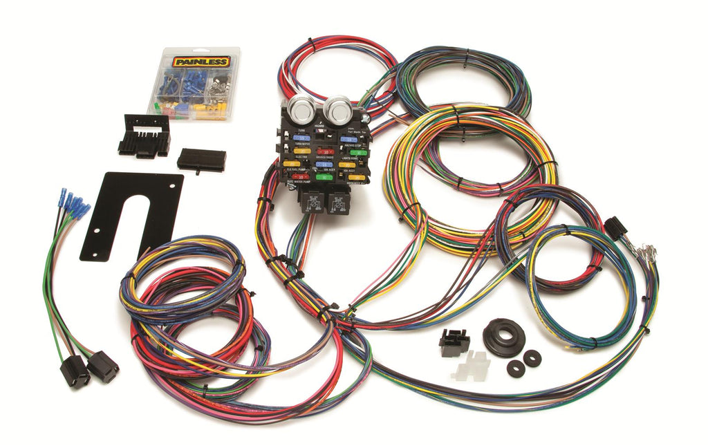 If you want to keep your race car streetable and want to use all of your factory switches instead of a switch panel, Painless Performance 21-circuit Pro Street chassis harnesses are for you. Each wire is labeled and is pre-terminated at the fuse block for easy installation. They also include an optional connector if you want to use a GM column mounted ignition switch. Also, with each harness is a terminal assortment kit, with the necessary connectors for your turn signal switch, headlights, and alternator. Each wire is custom printed with the circuit identification as well as using GM color codes for easy installation.