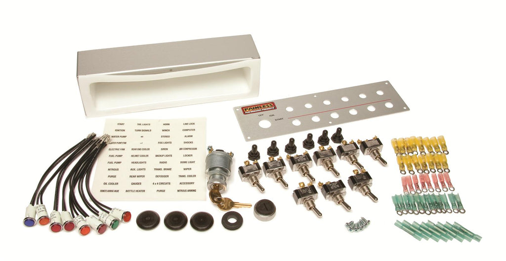 Painless Performance extreme off-road switch panels are the perfect panel for off-road use. Each panel includes: toggle switches, weatherproof toggle switch covers, indicator lights, a formed polyethylene liner, and a panel box for roll cage mounting. These switch panels can be dash mounted by removing the included box for added flexibility. Painless off-road switch panels include hard parts only, the included wire is for ground splicing of the indicator lights.Brand: Painless Performance