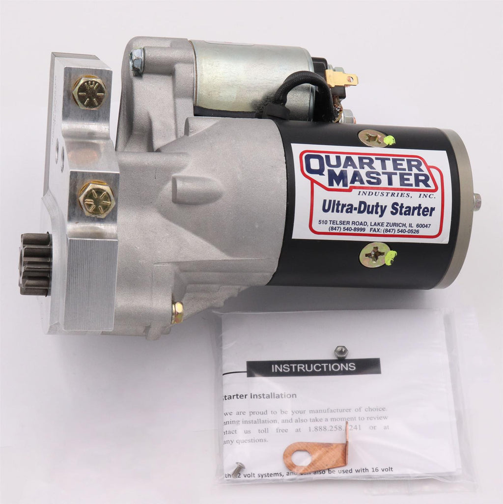 Quarter Master Ultra-Duty starters give your race car a good start to a great finish! These mini starters are ready for track duty with massive cranking power, heavy-duty solenoid and bearing assemblies, and CNC-machined billet aluminum adapter mounts for increased torque and a precision flywheel fit. Quarter Master Ultra-Duty starters are ready to meet the temperatures and demands of your high-compression engine. Think you're saving money buying a less expensive starter? Inferior starters will leave you cold on the street and track--not good! Bolt on the power to get started--bolt on track-tested Ultra-Duty starters from Quarter Master.Brand: Quarter Master