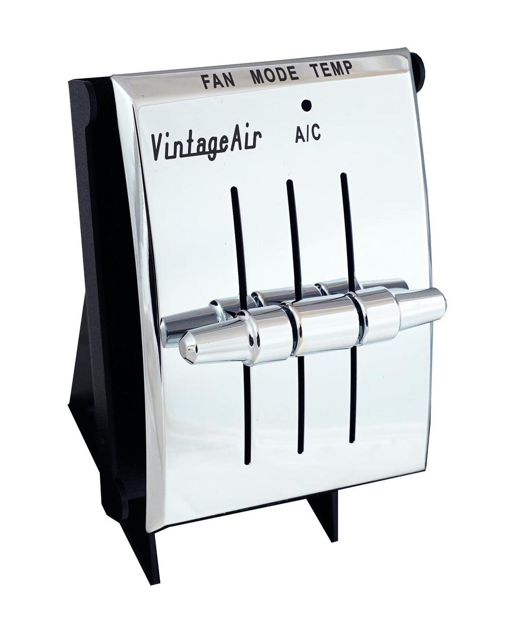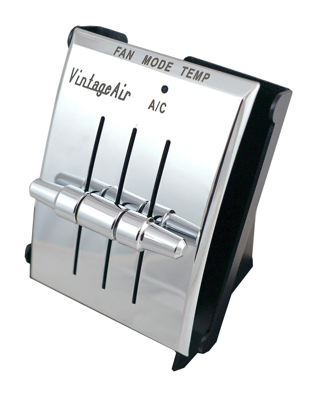 Vintage Air control panel upgrade kits are machined from 6061 T-6 billet aluminum, then triple chrome plated with laser-etched lettering. These bolt-in replacements are designed for Gen IV and Gen V systems, and feature LED "A/C on" indicator with beautifully designed variable slide adjustments for fan speed, temperature, and air delivery selection. Vintage Air control panel upgrades install in the OEM dash location with the included hardware.