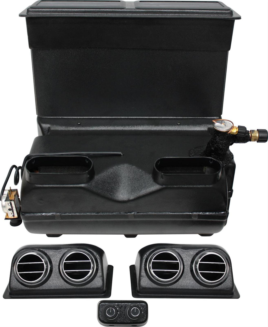When space is limited, you can still get your classic chillin' with Vintage Air High-Capacity Trunk-Mount System. These trunk mounted systems deliver much more volume than standard trunk systems and are ideal for larger cars. These Monsters have molded dual louvers that mount under your deck to your backseat package tray and rotary knob switch panel. Installation is easy and not at all scary--the systems include an evaporator, mounting brackets, louvers, and an A/C dust hose and drain kit. For immense airflow with monstrous chilling power, choose Vintage Air High Capacity Trunk Systems.Brand: Vintage Air