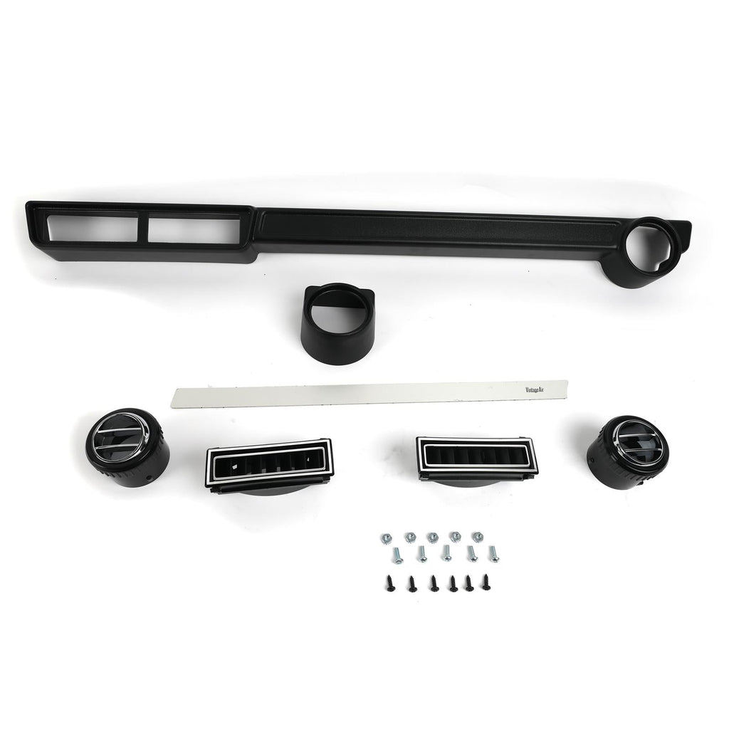 Notes: Kit works well with any flat underdash installation. Two-piece louver kit with one piece measuring 4.75 in. long and the other measuring 32 in. long with two round and two rectangular vents.