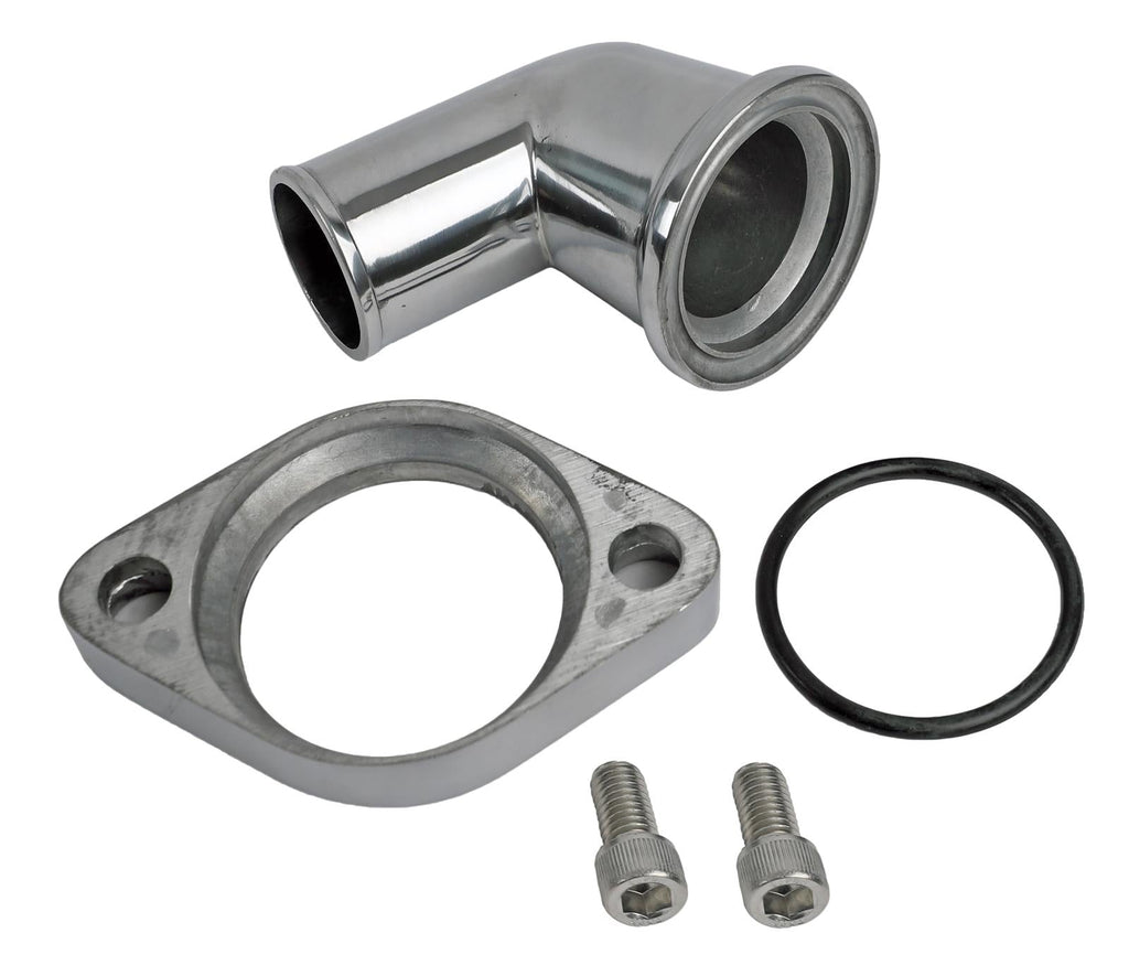Finish off your intake manifold with one of these Weiand swivel water necks. They'll provide you with good looks, excellent quality, and precise fit at a great price. The water necks are manufactured from high-quality aluminum and come in your choice of polished, chrome plated, or black powdercoat finishes. Weiand water necks are also available in four different outlet configurations—so you can get the right fitment for your cooling system. All water necks include an O-ring seal, plate, and hardware for easy installation.Brand: Weiand