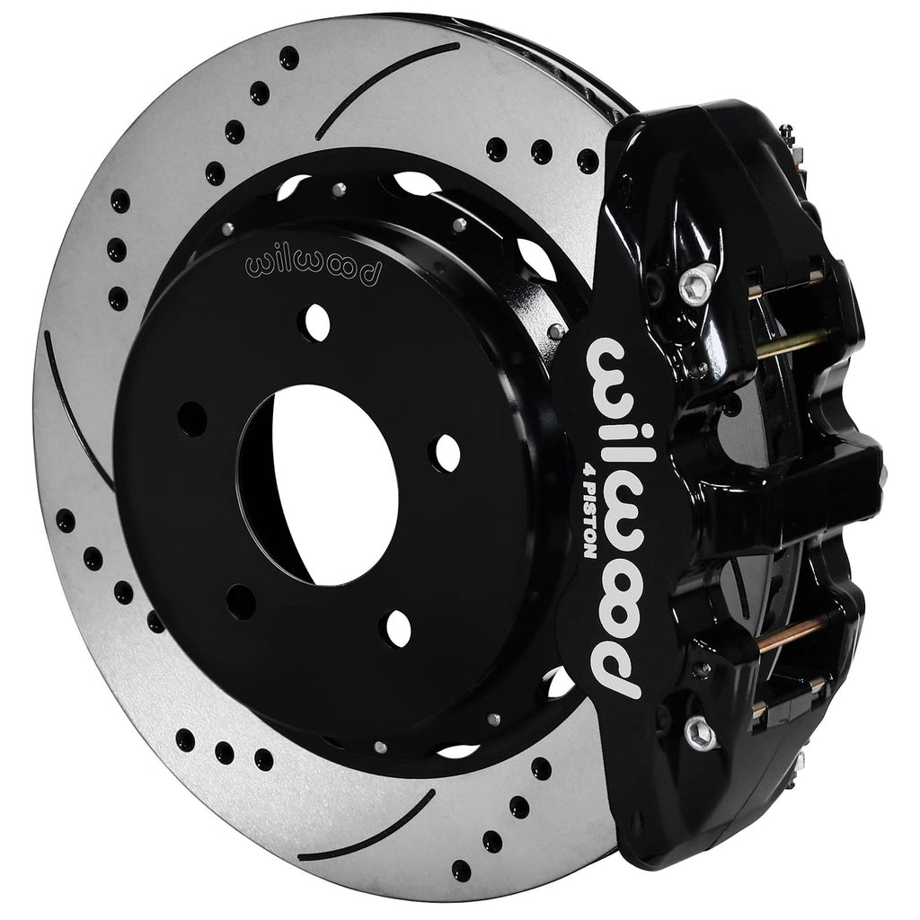Wilwood AERO4 Big Brake rear parking brake kits replace the factory disc brakes and use the OE parking brake assembly as a complement to front big brake upgrades on late model trucks, SUVs, and high performance vehicles. High-capacity braking from the AERO4 calipers (black or red powdercoat), high-friction BP compound pads, and oversized rotors (slotted or drilled/slotted) are matched to the OE master cylinder output, ABS function, and individual vehicle bias requirements. Wilwood AERO4 Big Brake rear parking brake kits provide enhanced brake performance, increased durability, and high-tech style to complement big wheel, tire, and suspension upgrades on customized vehicles and all others with increased brake requirements.
