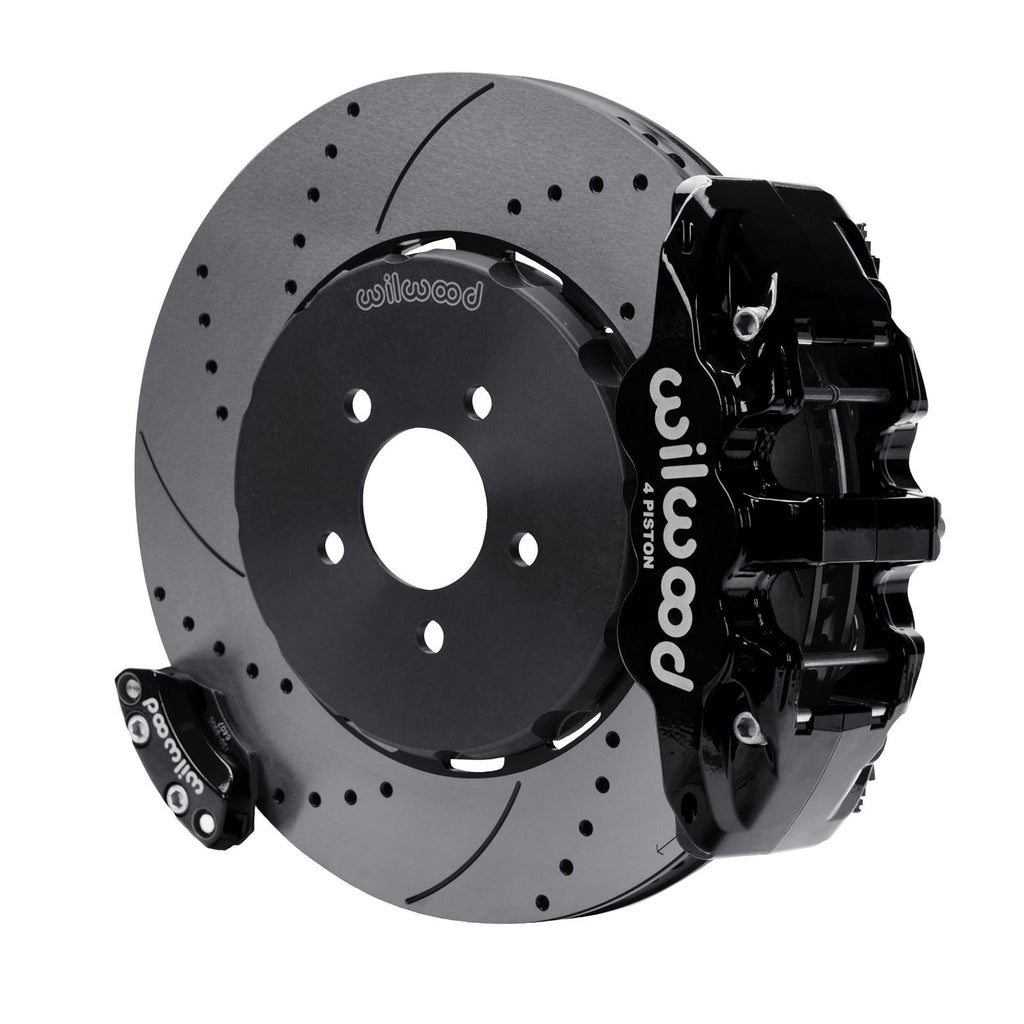 Wilwood AERO4 rear electronic parking brake kits provide the ultimate Big Brake solution for popular muscle car rear axles that require a parking brake. Containing 4-piston powdercoated calipers, oversized 14 in. 2-piece rotors, and high performance BP compound pads, the kits provide optimized and balanced braking to complement front Big Brake upgrades on all types of custom, show, and high performance street machines. The unique electronic parking brake caliper provides high-torque static holding power for parking without mechanical cabling. Wilwood AERO4 kits are supplied with control unit and harness assembly for simplified installation and use.Brand: Wilwood Disc Brakes