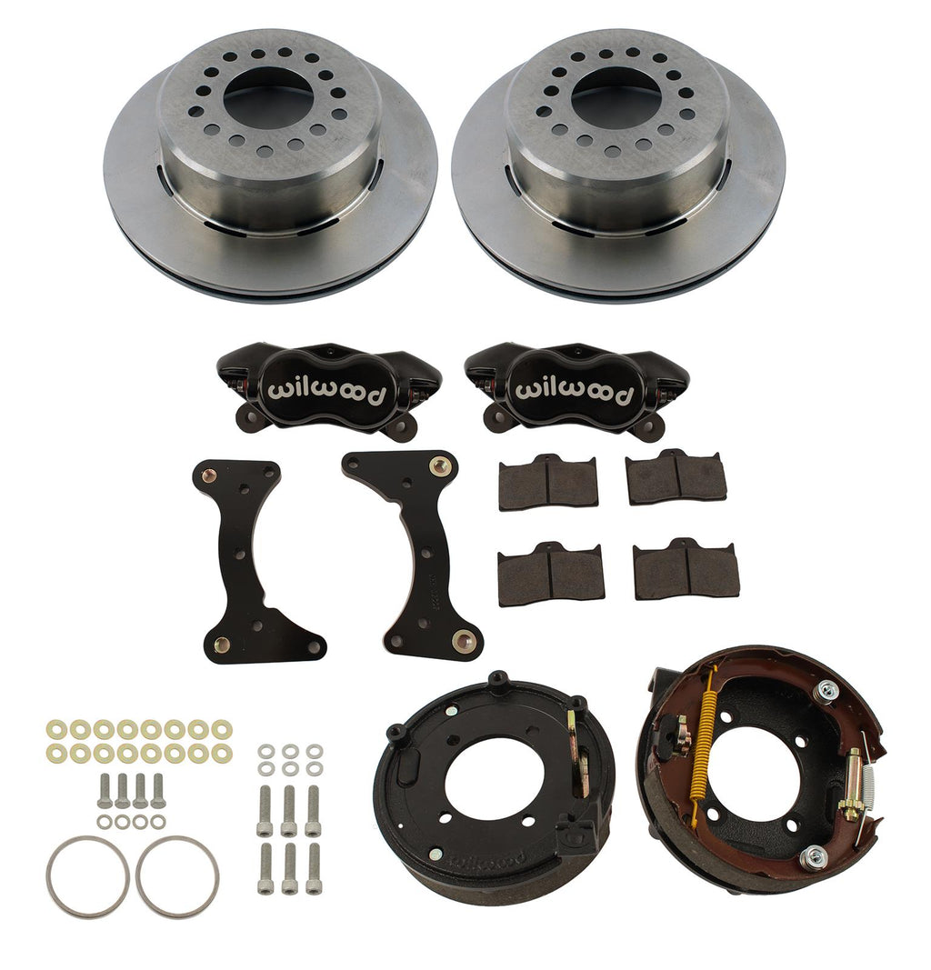 Wilwood forged Dynalite rear parking brake kits provide the best solution for many rear axles requiring a parking brake. The forged billet Dynalite 4-piston calipers, one-piece drum/rotors, and high-friction pads provide balanced braking for all types of performance street, strip, and show machines. Their internal shoe parking brake design stays hidden, but has excellent static holding power for parking. Wilwood offers optional caliper finishes and rotor designs to enable the builder to personalize the style and optimize brake performance for every individual application.Brand: Wilwood Disc Brakes