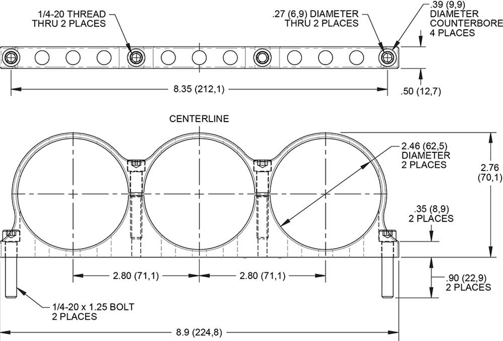 Notes: Bracket has 3 2.46 in. I.D. holes. Holds 3 reservoirs.