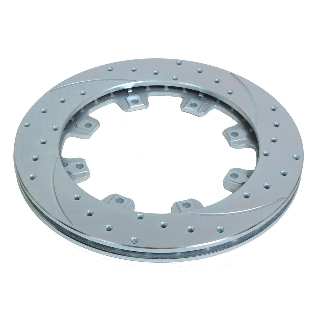 For custom, show, and high performance sport driving, SRP rotors offer the high-tech look and improved performance of a directional cross-drill and face slot pattern. The venting and cleaning action of the holes and slots reduce pad glaze, disperse gasses, and decrease heat generated at the pad-to-rotor interface. The holes and slots also inhibit irregular pad compound buildup on the rotor faces, resulting in smoother engagement and improved pedal response in all conditions. The material removed also contributes to lower rotating and unsprung weight. Each rotor is precision-machined to less than .001 in. tolerances for overall flatness, parallelism, and radial run-out on long-grain carbon-iron castings. The rotors are finished with a black electro coat or silver zinc wash finish to provide corrosion resistance. SRP rotors are available in all popular sizes used in Wilwood's Pro Series and Big Brake conversion kits.